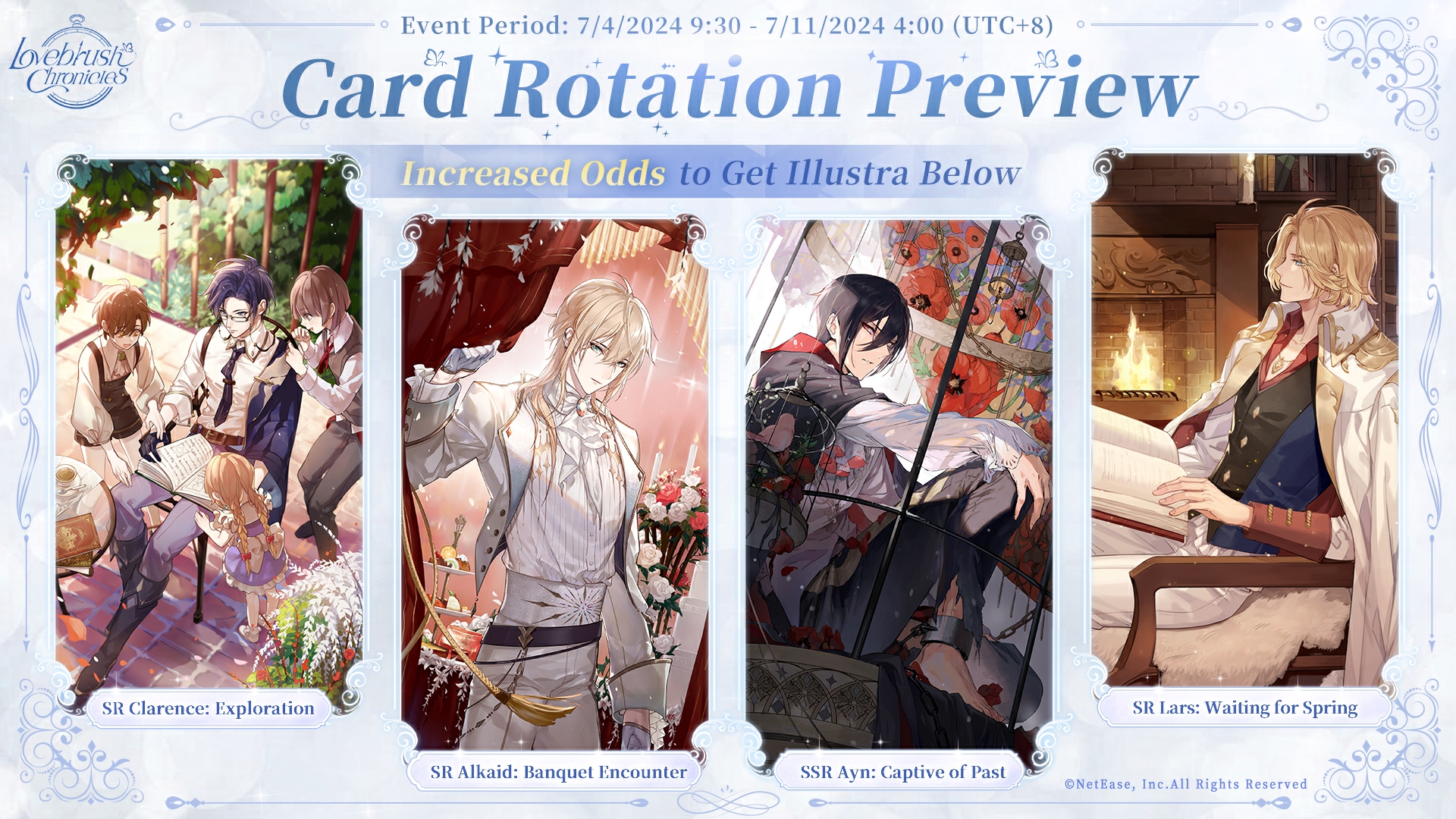 SSR [Ayn - Captive of Past], SRs [Clarence - Exploration], [Alkaid - Banquet Encounter] and [Lars - Waiting for Spring].